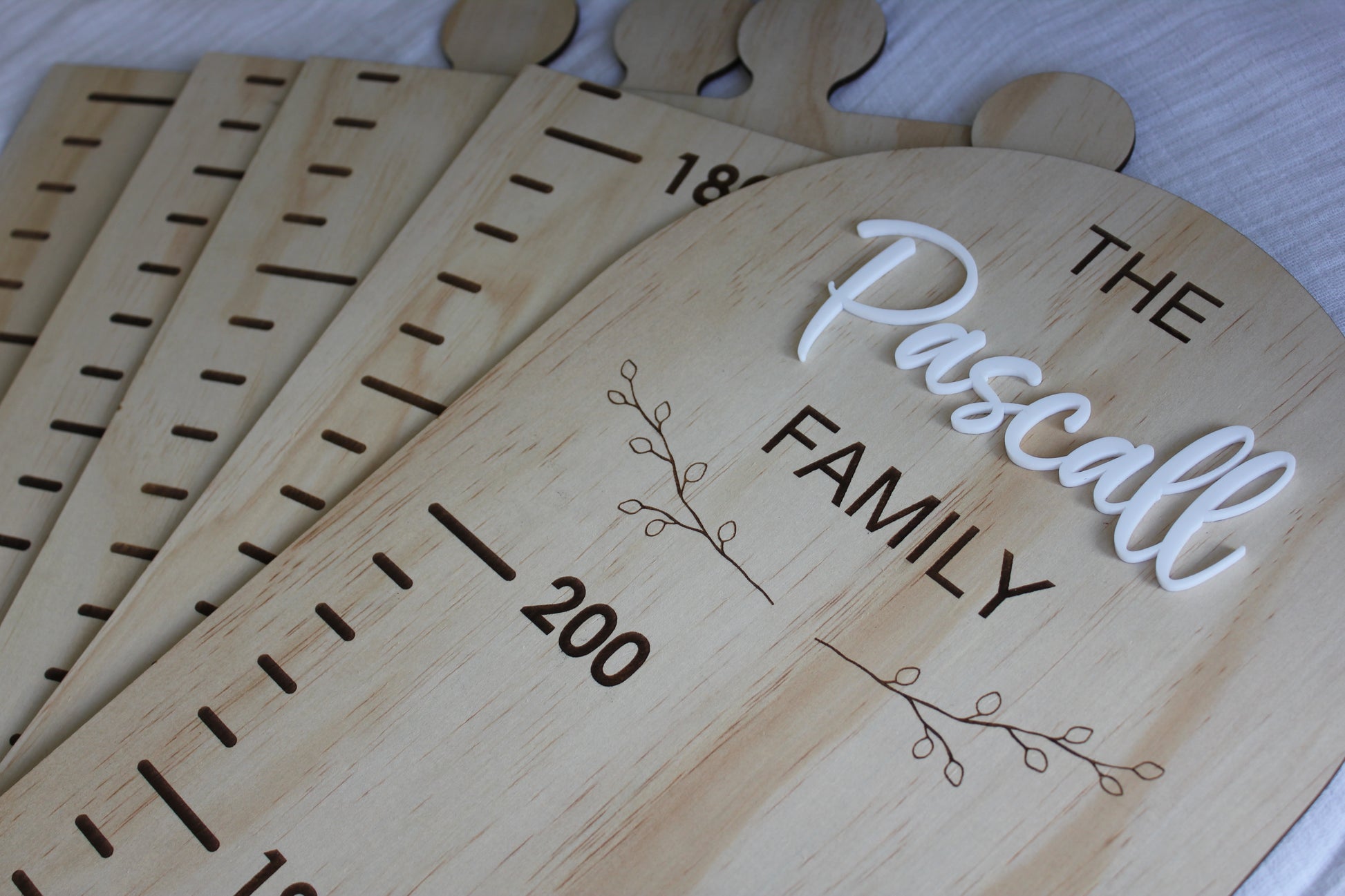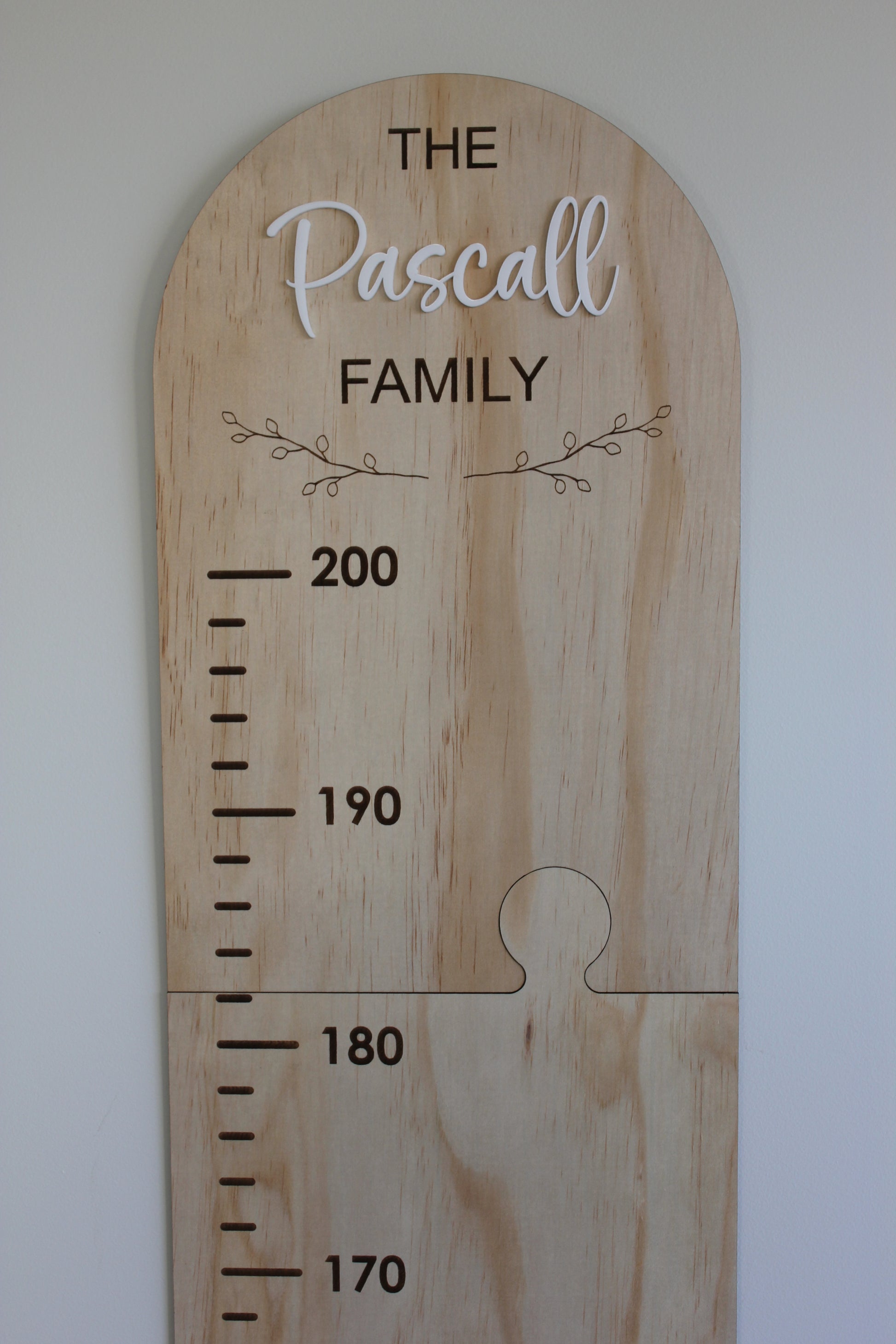 Our family height charts are personalised with your family name in the coloured acrylic of your choice. All other details are engraved. Each piece of the chart fits together like a puzzle for you to mount to your selected location. The wood used for our height charts is 3mm thick.