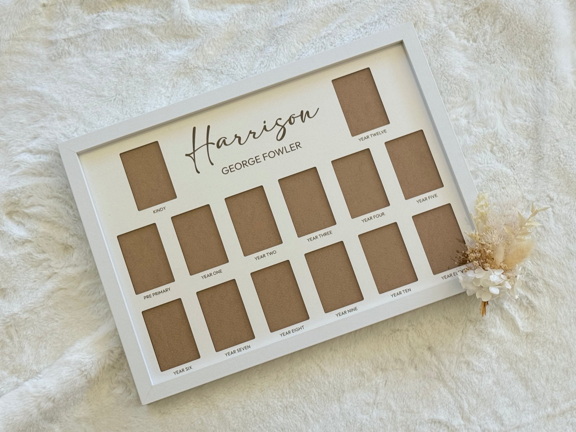 Capture and cherish every precious school year with our personalised School Years Photo Frames. Personalised with your child's name, this frame beautifully showcases their journey throughout their schooling life.